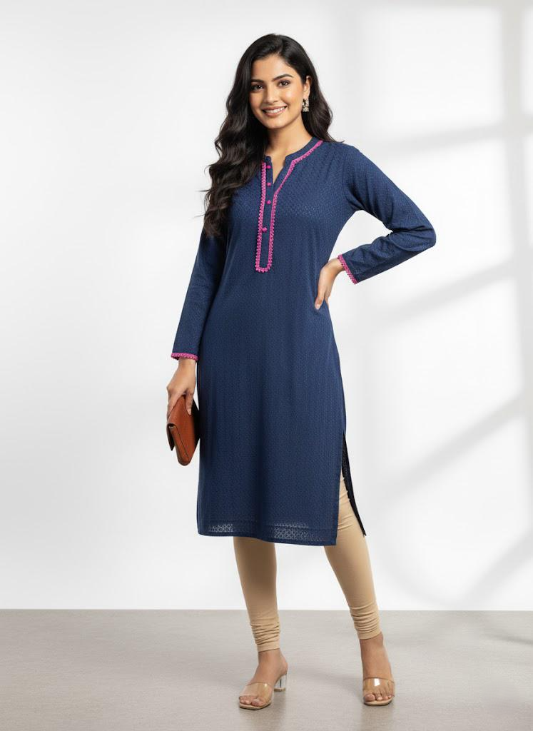 A graceful everyday kurti designed with subtle charm and comfort in mind. Crafted in a rich navy blue tone, this kurta features delicate textured detailing throughout, enhanced with contrast pink accents along the neckline and sleeve cuffs for a refined pop of color. The straight silhouette with side slits ensures ease of movement, while the long sleeves and clean finish make it perfect for both workwear and casual outings.