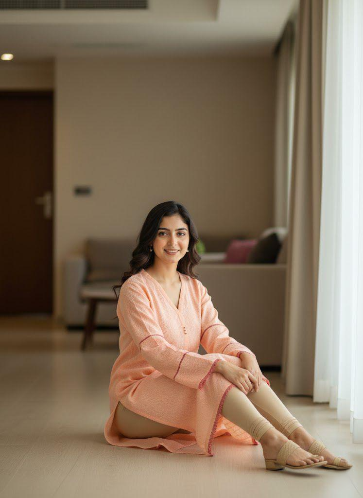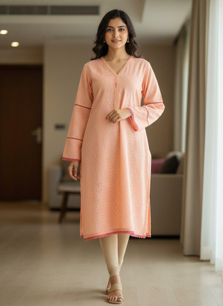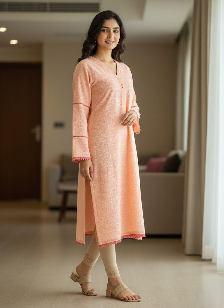 A graceful everyday kurti designed with subtle charm and comfort in mind. Crafted in a rich peach tone, this kurta features delicate textured detailing throughout. The straight silhouette with side slits ensures ease of movement, while the long sleeves and clean finish make it perfect for both workwear and casual outings.