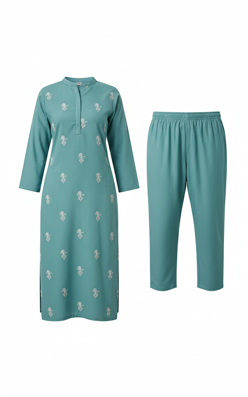 A breath of calm elegance — this soothing teal kurta set brings together subtle sophistication and everyday comfort. Adorned with delicate white motifs and tailored in a straight, timeless silhouette, it creates a look that feels both refreshing and refined. Paired with minimal sandals and statement earrings, this ensemble is perfect for serene daytime outings, festive simplicity, or graceful casual wear.